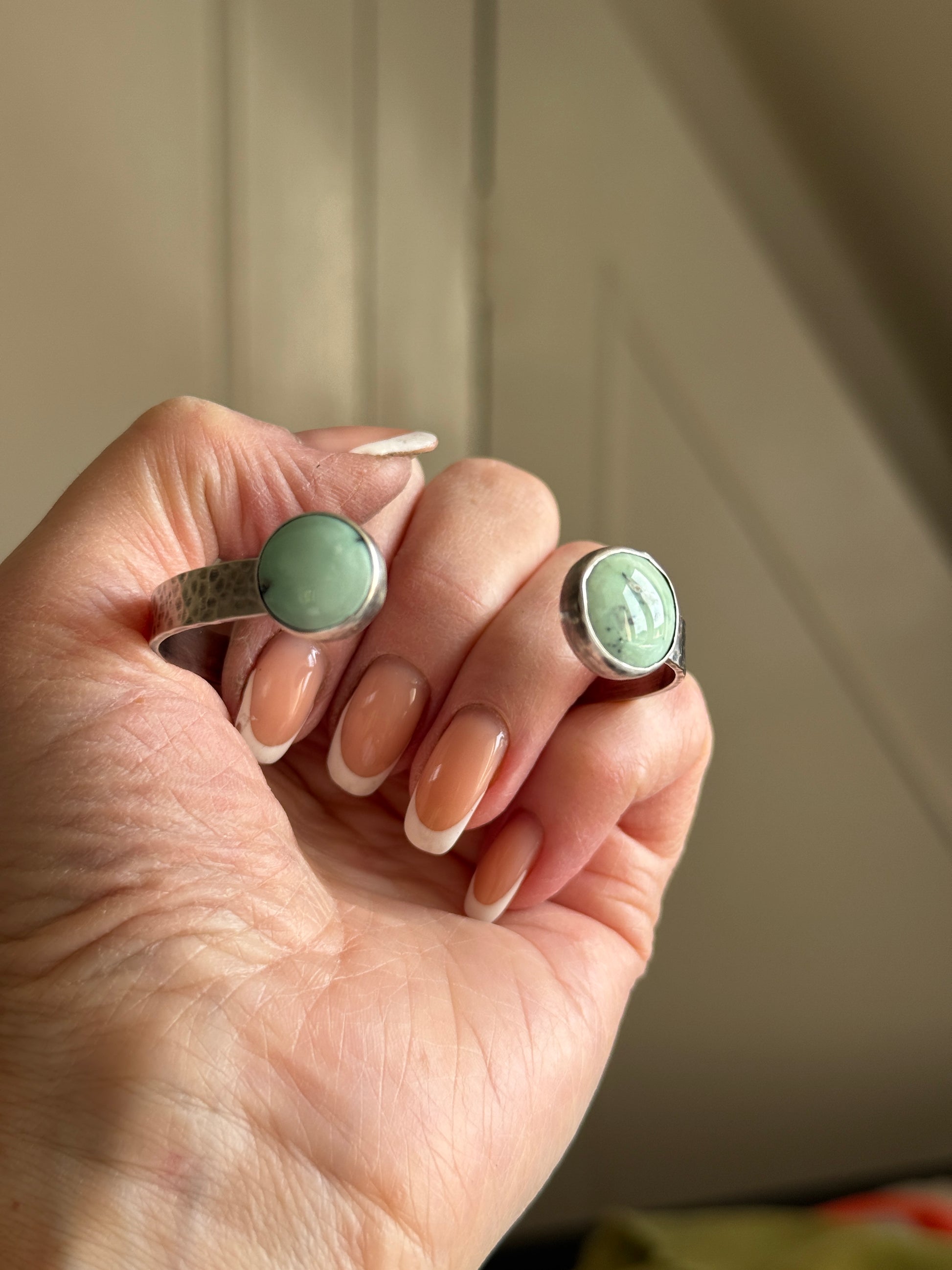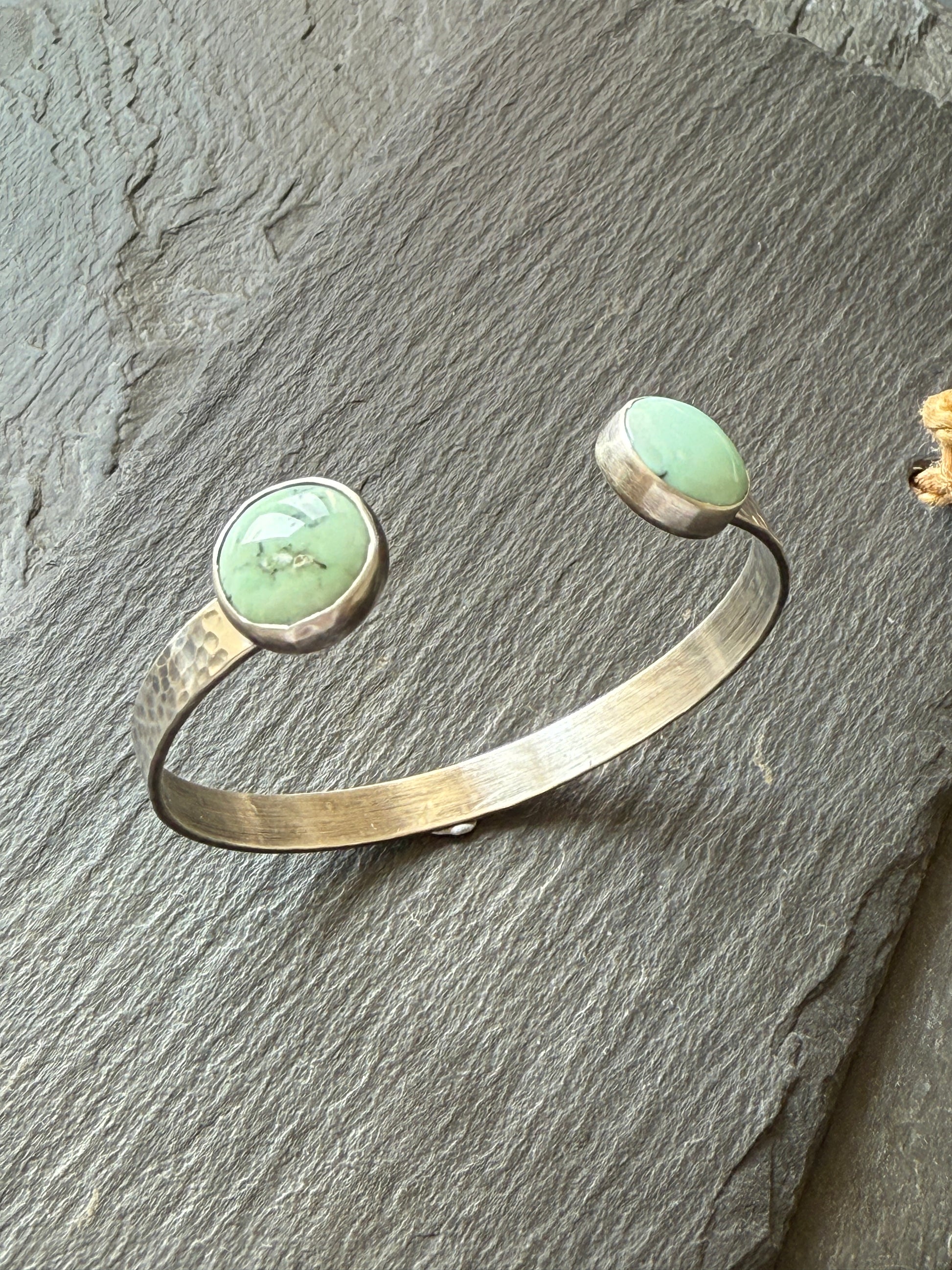 Featuring a sterling silver cuff bangle which has been oxidised and hammered for texture. The turquoise gemstones are set in fine and sterling silver. The bracelet will fit a 6 - 6.5”wrist. The stones measure 14mm and 13mm.