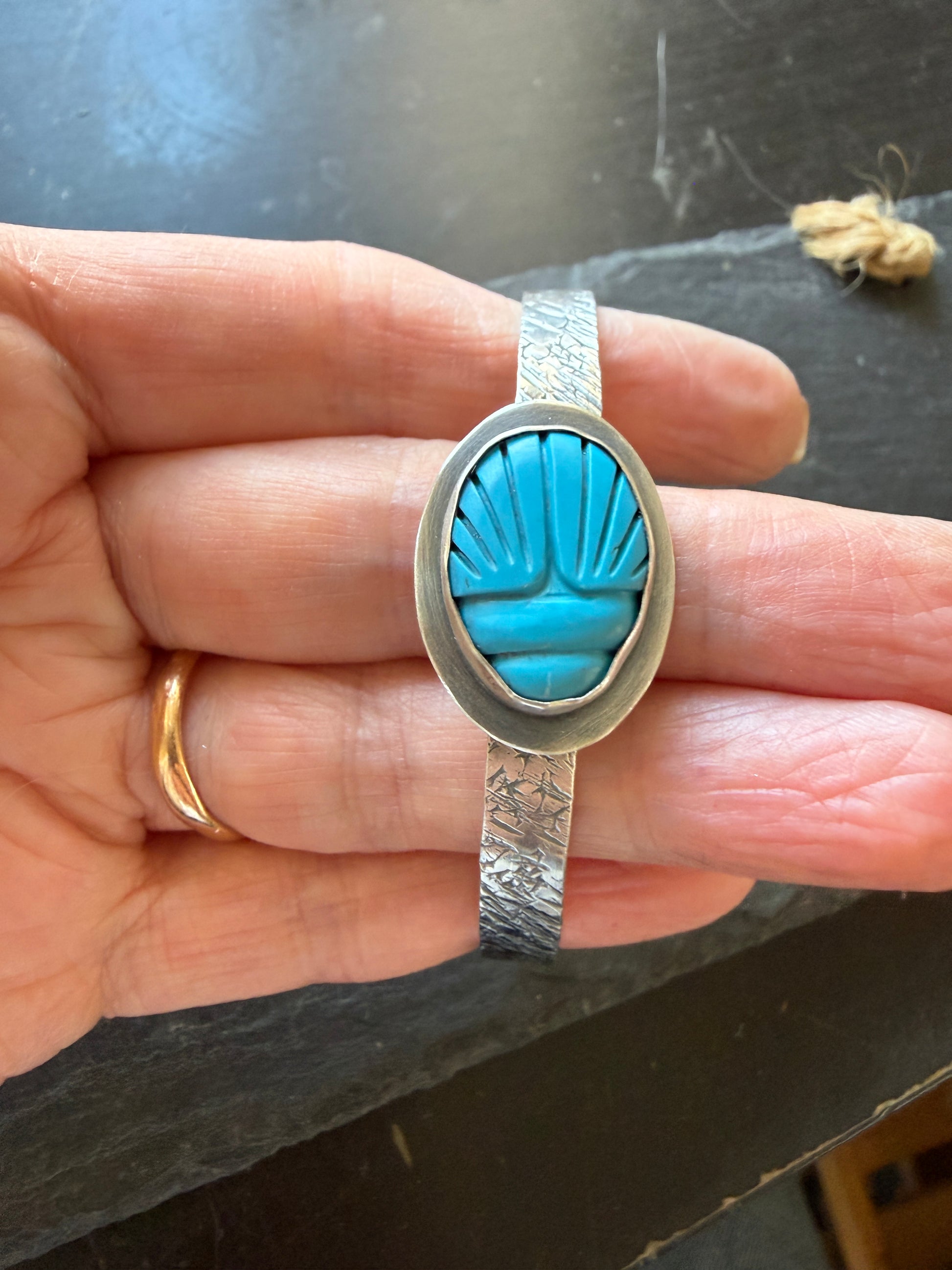 Featuring a carved scarab turquoise. The stone is set in fine and sterling silver and sits atop a texturised sterling bangle. The stone measures 18mm x 13mm approximately. The bangles fit a 6-6.25” wrist. This type of bangle fits on to the wrist sideways.