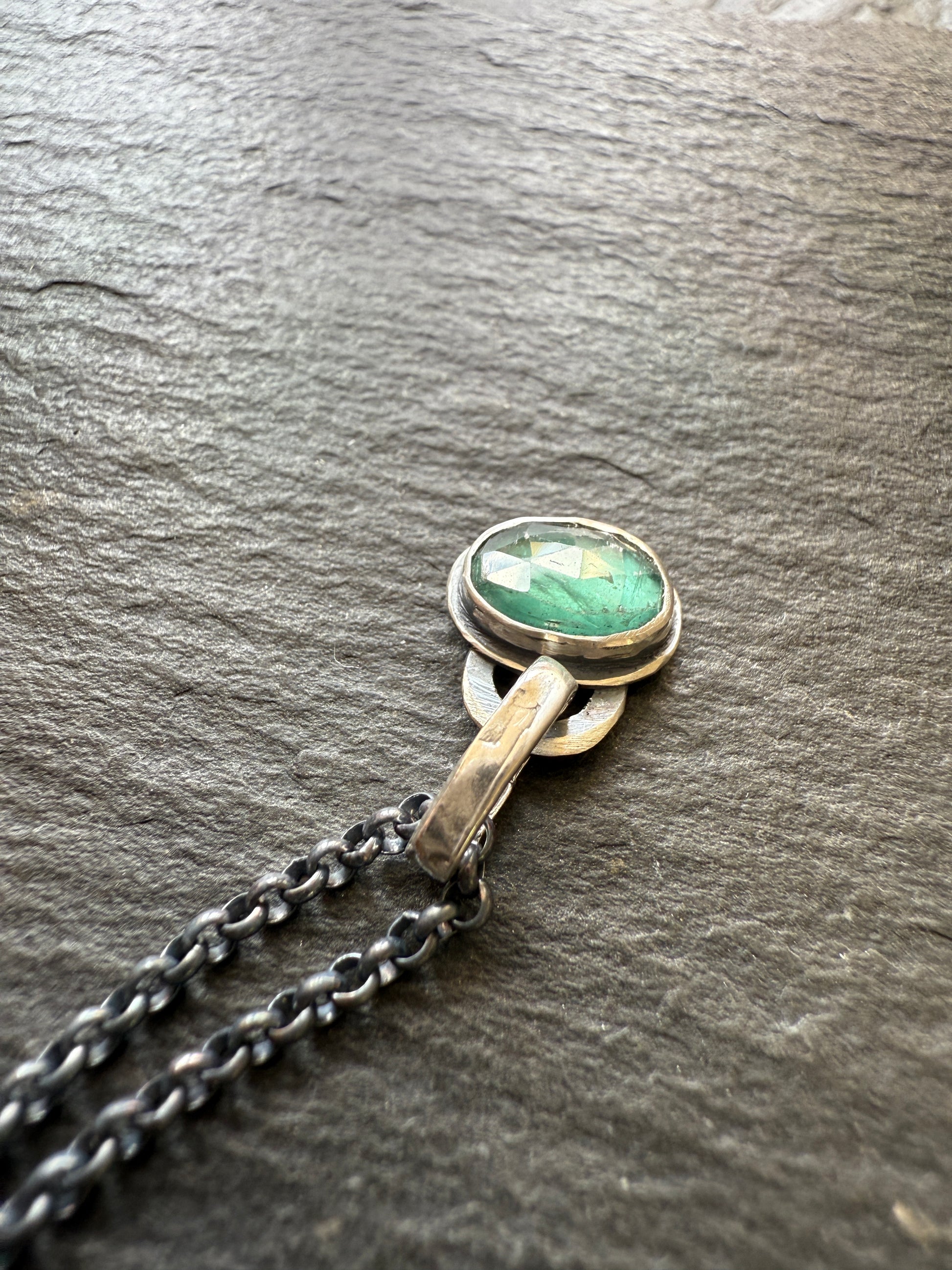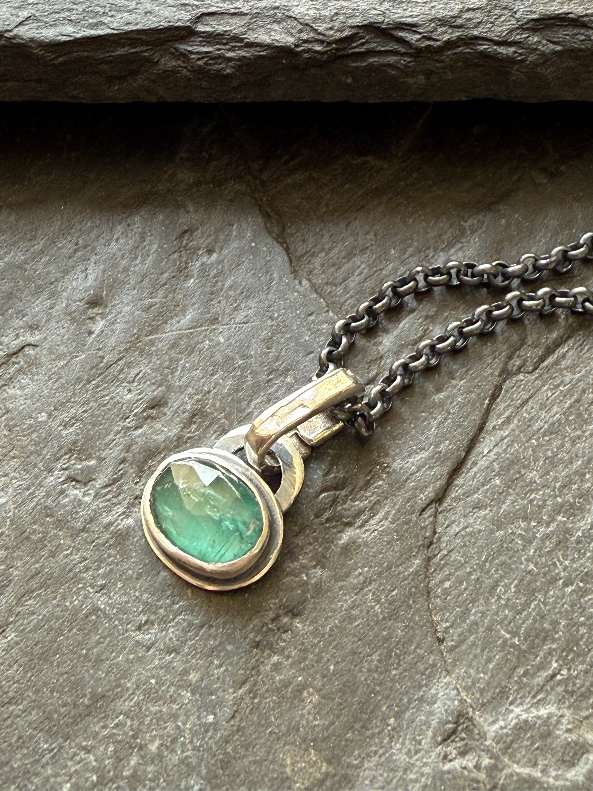 Featuring a dainty kyanite gemstone (9mm x 7mm) bezel set in fine and sterling silver. This little dainty gem hangs from a sterling link and a dark oxidised sterling 16” chain. This ultra dainty necklace is perfect for layering.