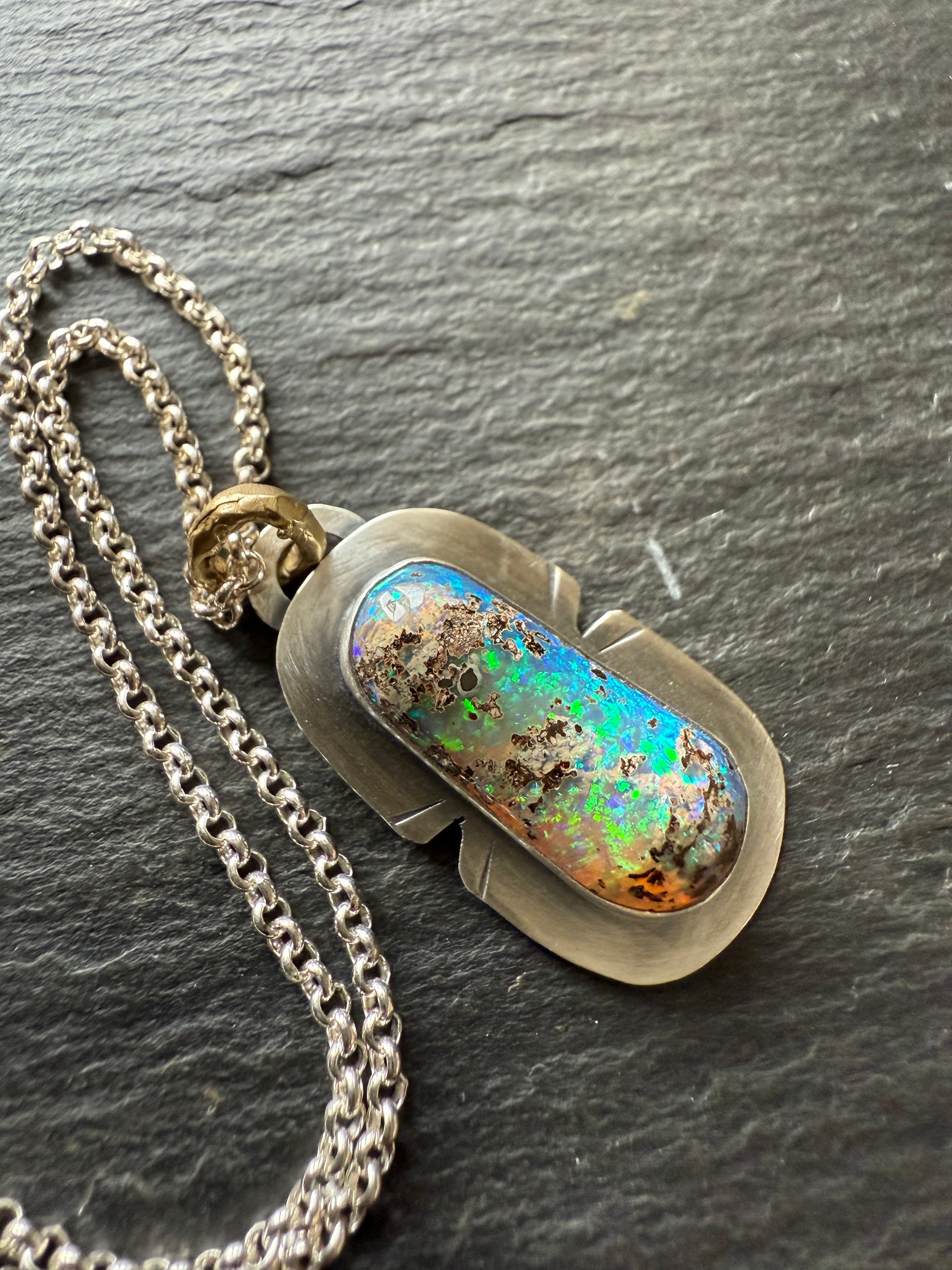 Featuring a stunningly beautiful boulder opal. This gorgeous stone is full of blue and green speckles of colour. Set in fine and sterling silver with a gold bronze link a sterling silver 18” chain. The stone measures 20mm x 10mm excluding the setting.