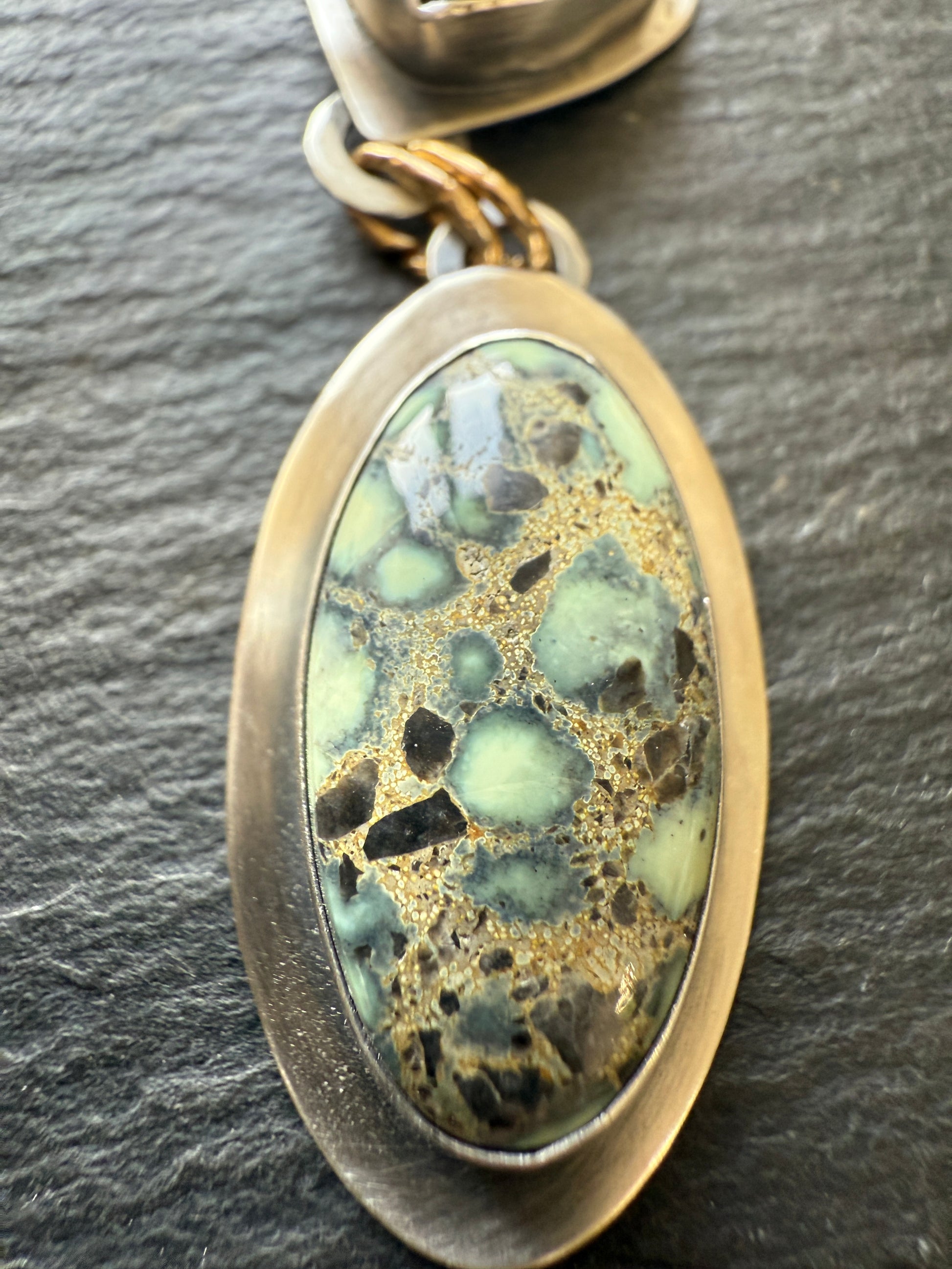 Featuring two beautiful and unique Variscite Turquoise stones, bezel set in fine and sterling silver, oxidised and polished to a rustic patina. The pendant hang from gold bronze Links and a dark oxidised sterling silver link chain of 18 inches. The stones measures 26mm x 14mm and 19mm x 17mm approximately
