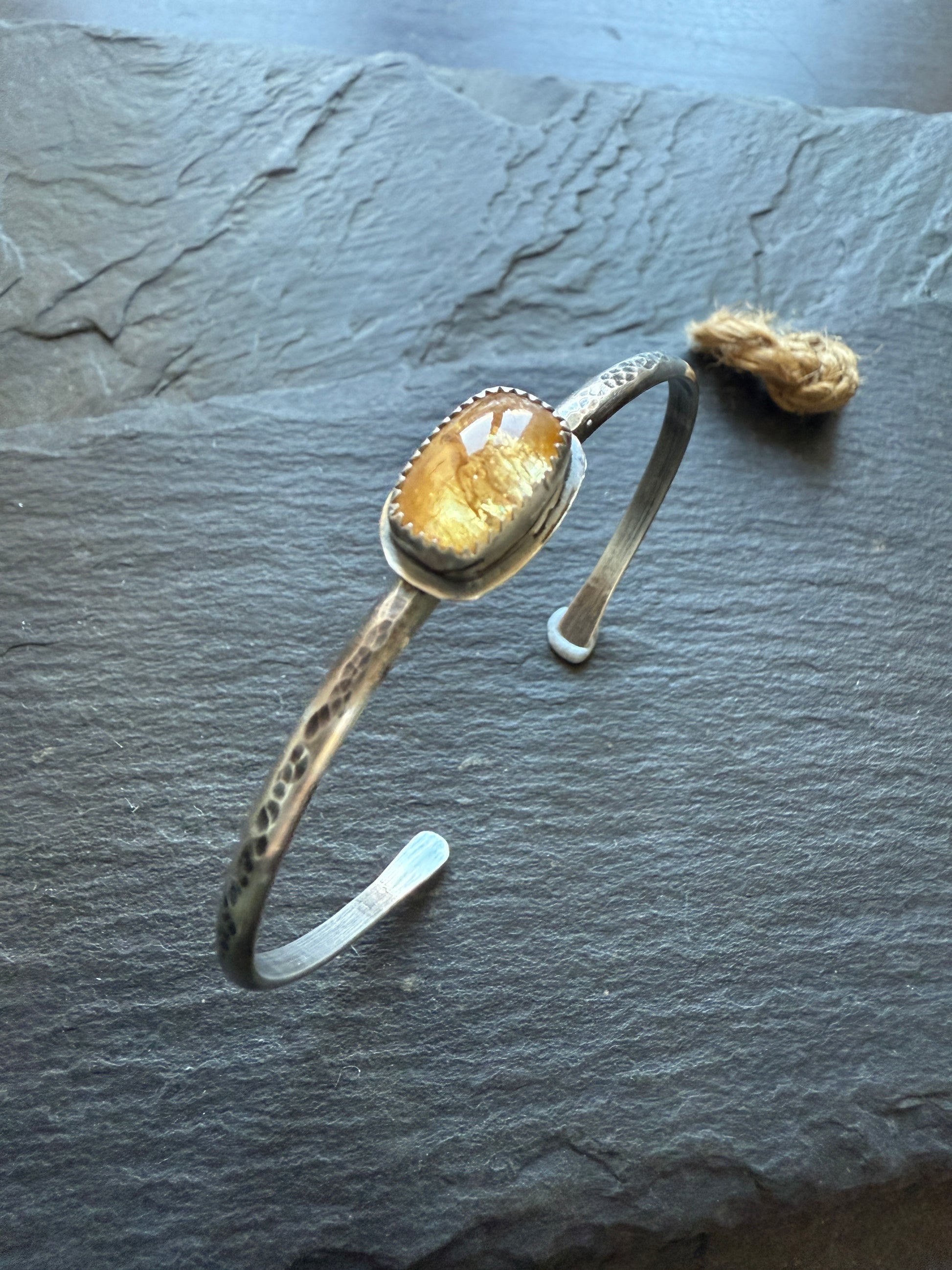 Featuring a sunny yellow Tourmaline which is bezel set in sterling silver and sits atop a hammered wide sterling bangle.